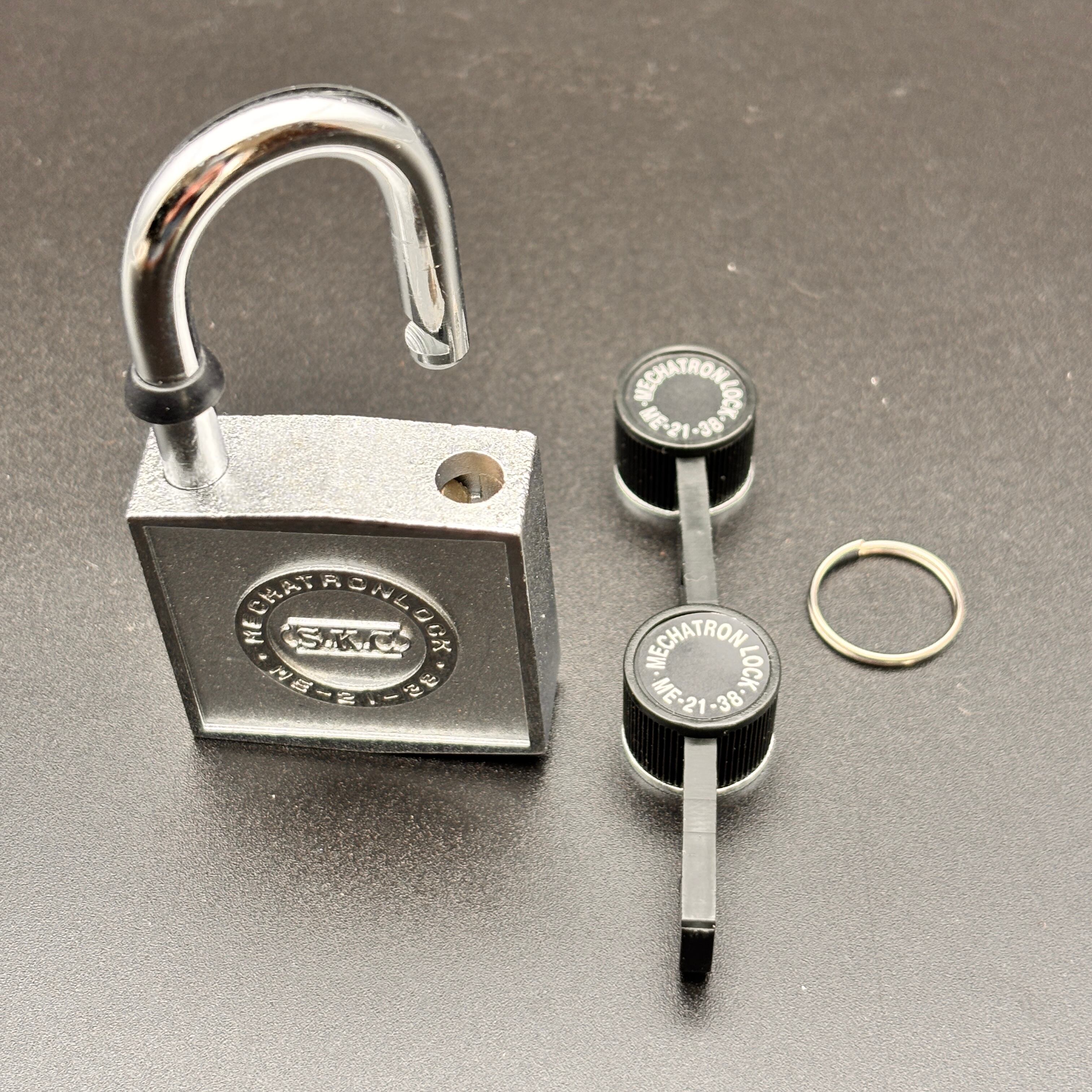 SKC メカトロック ME21は、磁気反発機構を使った特許構造の鍵穴なし南京錠です。