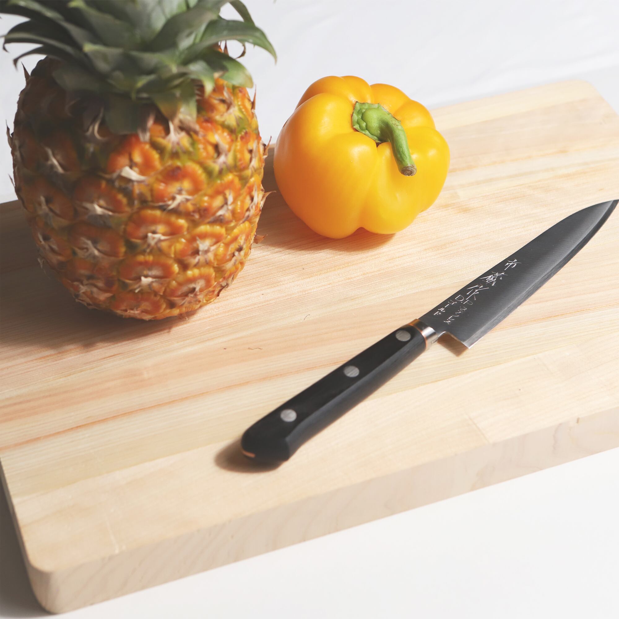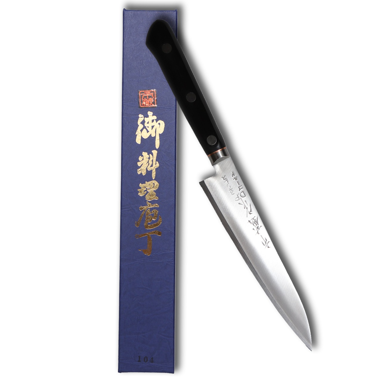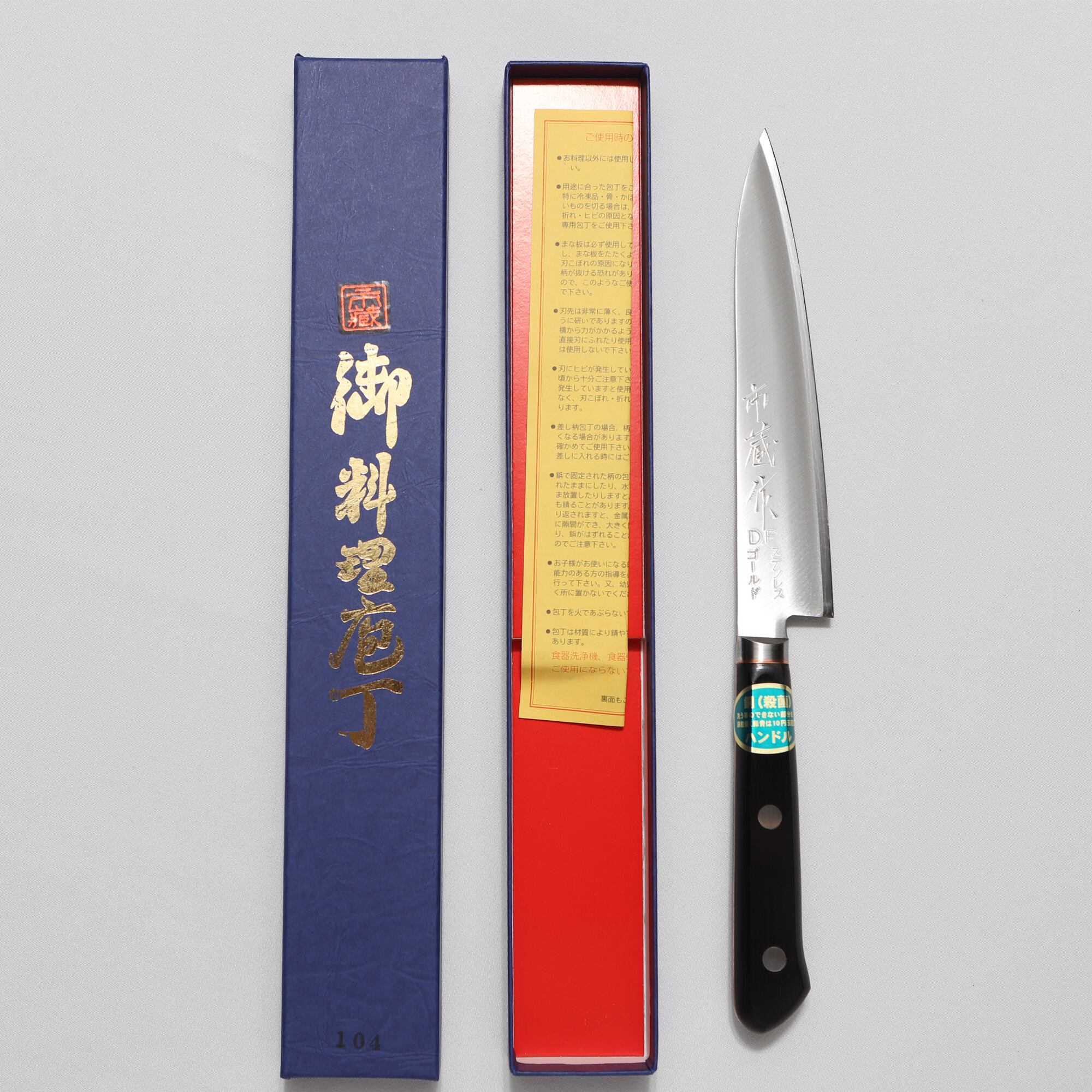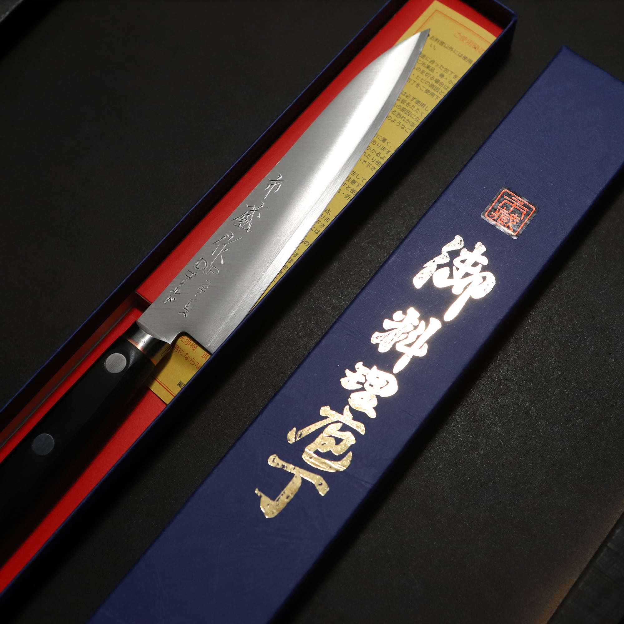 市蔵の「ペティV金1号」は、料理の質を高める小型包丁です。高硬度の「V金1号」芯材を使用し、肉、魚、野菜、果物をスムーズにカットできます。刃渡り150mmで、果物の皮むきや細かな作業に最適です。黒合板の柄には抗菌作用のある銅口金を採用し、衛生的で手に馴染みやすいデザインとなっています。錆びにくい素材で手入れも簡単です。美しい刻印と高級感あふれるデザインが、料理のモチベーションを高めてくれます。